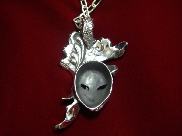 孔雀と仮面を組み合わせた大きめのペンダントトップ。 妖艶さと不思議さを持ち合わせた存在感のあるデザインです。